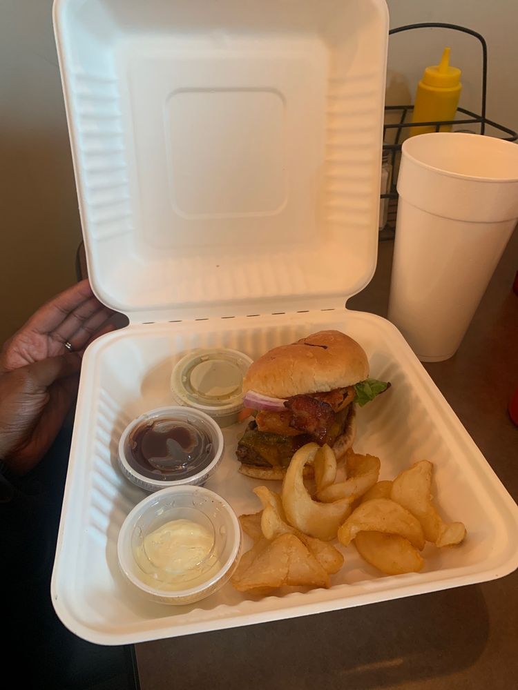 Topped with Bourbon BBQ sauce, Applewood Smoked Bacon, pickled Jalapenos, Cheddar Cheese, and an onion ring on a Brioche bun